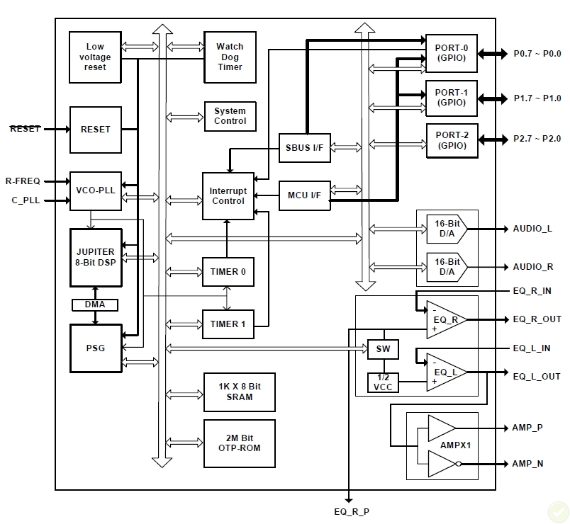 The H6162P series is based on Helios's 8-bit MCU (JUPITER) and equipped with a powerful programmable sound generator (PSG) for processing sweet-sounding. Via proprietary system bus, the MCU (JUPITER) features efficient addressing register and memory timing control register (MTR) to access internal/external memory and I/O devices with appropriate timing.