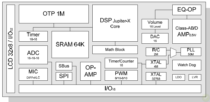 • Built-in class AB/D/PWM 8/0.5W circuit, direct drive speaker or buzzer device with 16 levels control.