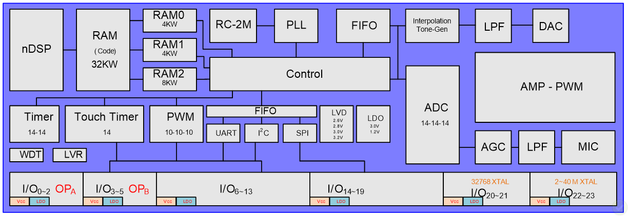 n Built-in 24 I/O with voltage option (LDO/Vcc), P00-P15 feature interrupt and wake-up function