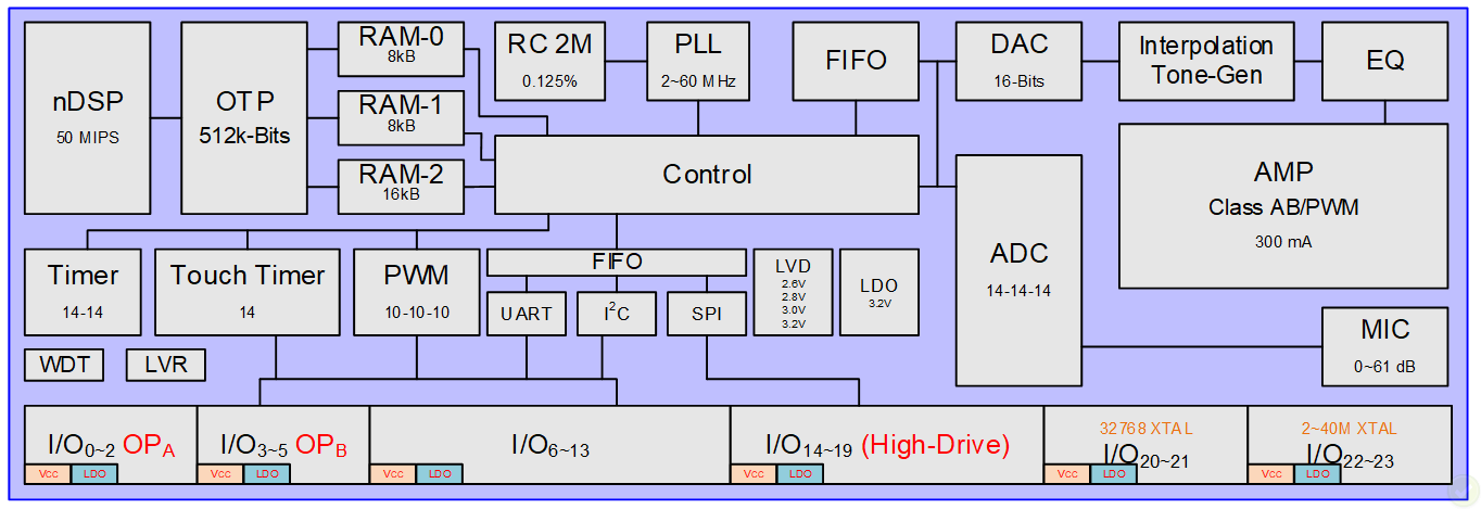 n Built-in 24 I/O with voltage option (LDO/Vcc), P00-P15 feature interrupt and wake-up function
