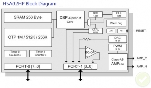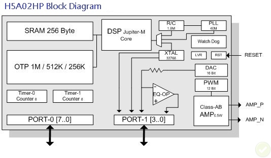 The H5A02HP is based on OTP memory for voice controller. With high performance 8-bit CPU core, it can be designed to many application fields by software. Features the powerful class-A/B speaker amplifier and Delta-Sigma DAC, it can provides good quality audio/voice outputing. There is one optional set of external clock for 32768Hz crystal.Helios provides the IDE (intergarion development system) for programming assembly language and the easy statement fuction for simplic speech application.