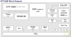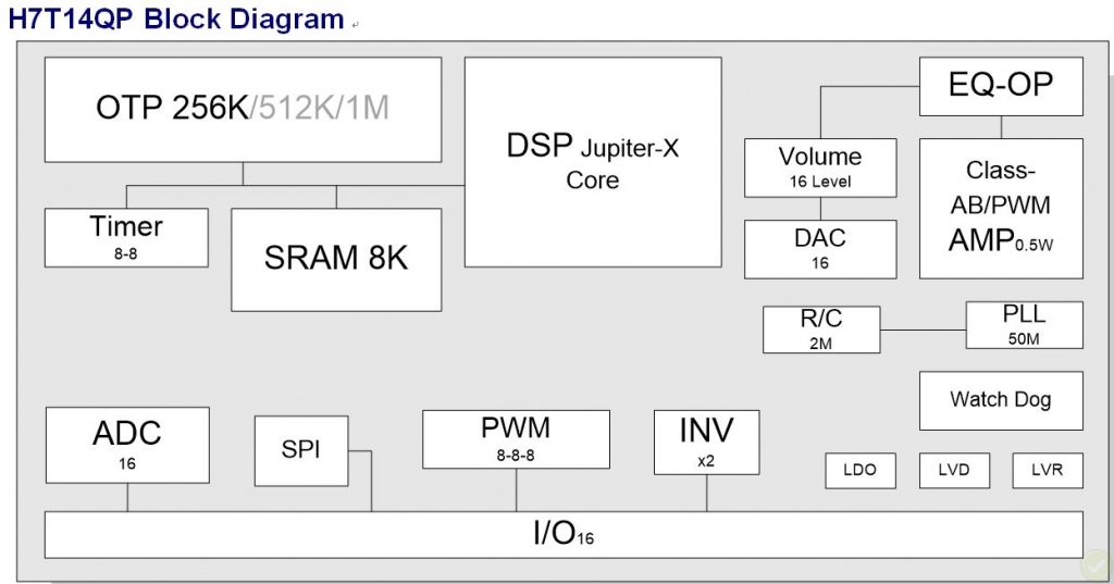 The H7T14QP series are for speech microcontroller, less I/O count (only 16 I/Os), and provide 5 alanlog inputs for ADC.
